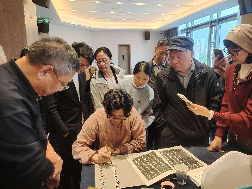 杭州国画院特聘教授钮利刚为大家示范书法与篆刻技法,他认为,书法练习作为日课,不宜贪多,立法要正,吃透一家书法经典之后,再进行转益多家;不宜毫无思绪的练习,要有方向、有意识、有思考,书法功底才能“一日有一日之变化和境界”,钮教授还通过书印看稿,一笔笔纠正与示范,颇具启发性。