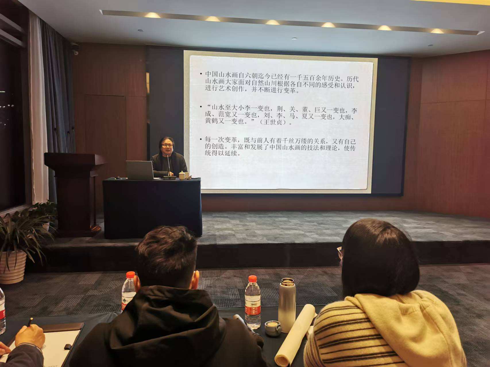 中国美术学院教授张谷旻作题为《搜妙创真——中国山水画》的主题讲座,他首先为大家梳理了中国山水画发展历史,继而列举历代山水创作文论观点,阐述了“师古人”、“师自然”、“师心”的辩证关系,继而从笔墨的迁想妙得进入不同层次的大道之境。张教授还对大家的作品逐一指导,并提出了宝贵意见。