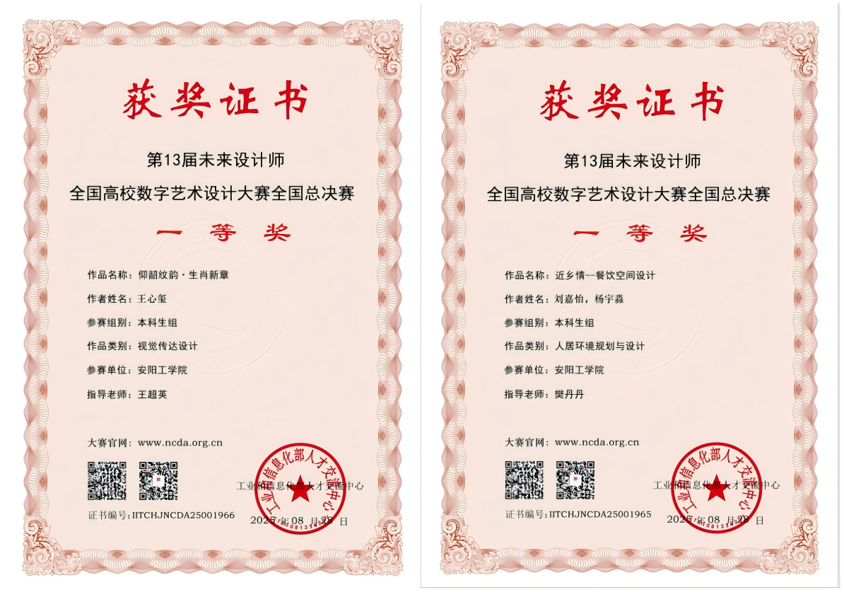 近日,在2025第13届未来设计师·全国高校数字艺术设计大赛(NCDA)竞赛中,我院师生荣获省级以上奖项14项,其中国赛一等奖2项,二等奖1项,三等奖1项;省赛一等奖6项,二等奖8项。王超英、樊丹丹等老师荣获“优秀指导老师”称号。